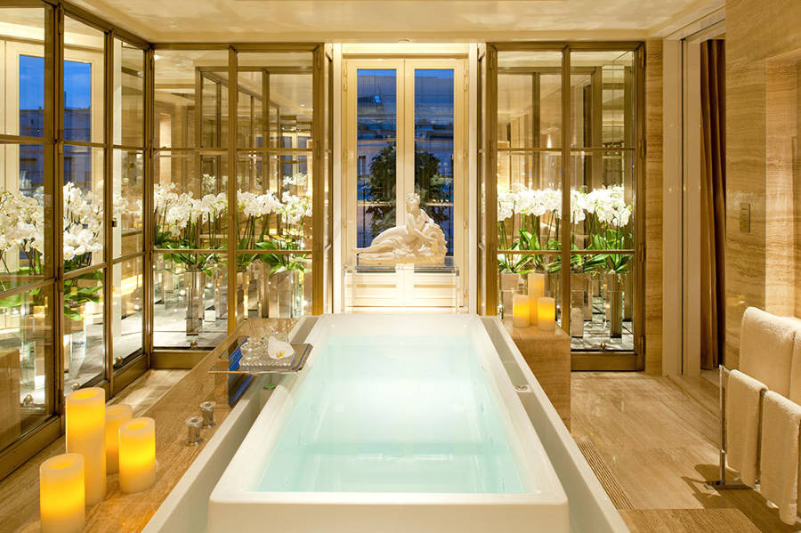 Εξίσου μοναδική εμπειρία προσφέρει και το μπάνιο της σουίτας του ξενοδοχείου Four Season Hotel George V στο Παρίσι. Δεν προσφέρει μόνο απίστευτη θέα της πόλης, αλλά και ένα μπάνιο, αξιοζήλευτο, ιδανικό για χαλάρωση. Το μάρμαρο είναι το στοιχείο που κυριαρχεί από το δάπεδο ως την οροφή, ενώ το εντυπωσιακό design ολοκληρώνεται με μια infinity μπανιέρα με πίδακες και υποβρύχιο φωτισμό.