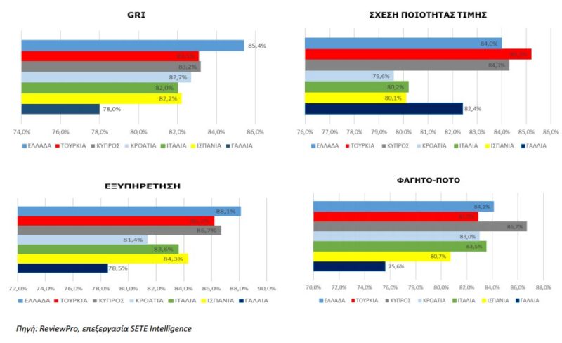 Στον τομέα της εξυπηρέτησης η Ελλάδα βρίσκεται στη πρώτη θέση με το εντυπωσιακό 88,1%. Στην εστίαση στην πρώτη θέση με 86,7% βρίσκεται η Κύπρος ένω η Ελλάδα βρίσκεται στη δεύτερη με 84,1% και ακολουθεί η Ιταλία με 83,5%. Όπως όμως αποτυπώνεται στις επόμενες σελίδες, η εικόνα ανά κατηγορία διαφοροποιείται και η Ελλάδα έχει συγκριτικά υψηλότερη θέση στις χαμηλότερες κατηγορίες και χαμηλότερη θέση της στις υψηλότερες κατηγορίες. Η Τουρκία έχει τη πρώτη θέση σε όλες τις κατηγορίες στη σχέση ποιότητα τιμής ενώ ο δείκτης ικανοποίησης μειώνεται στις υψηλότερες κατηγόριες.