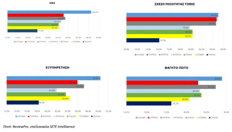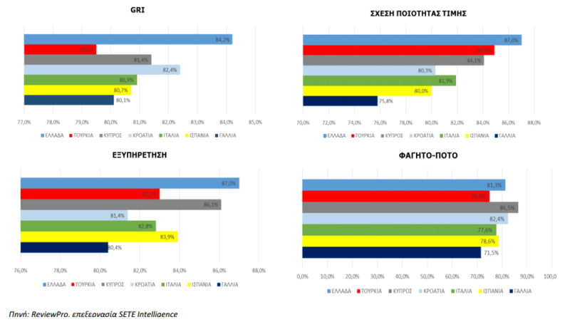 Τον υψηλότερο δείκτη ικανοποίησης με 90,7% κατέχει η Κροατία, ακολουθούμενη από τη Γαλλία με 90,6%. Στη τρίτη θέση βρίσκεται η Κύπρος με 89,8% και στη τέταρτη η Ισπανία με 88,6%. Η Ελλάδα βρίσκεται στη τελευταία θέση με 84,5% . Στη σχέση ποιότητας-τιμής η Ελλάδα κατέχει την προτελευταία θέση (82,2%) ενώ στην πρώτη θέση βρίσκεται η Κύπρος με 85,9%. Την Κύπρο ακολουθούν Τουρκία (85,4%), Κροατία (83,1%), Γαλλία (82,8%) Ιταλία (82,7%), ενώ η Ισπανία (81,0%) βρίσκεται στην τελευταία θέση. Στον τομέα της εξυπηρέτησης η Γαλλία βρίσκεται στην πρώτη θέση με 93,2% ενώ στη δεύτερη θέση βρίσκεται η Κύπρος με 92,1%. Η Ιταλία βρίσκεται στην τρίτη θέση με 91,8% ακολουθούμενη από την Κροατία με ποσοστό 90,4%, την Ισπανία (89,8%) και την Τουρκία (88,2%). Η Ελλάδα βρίσκεται στην τελευταία θέση με ποσοστό 87,7%. Στην εστίαση στην πρώτη θέση βρίσκεται η Γαλλία με ποσοστό 93,4% και στη δεύτερη η Κύπρος με ποσοστό 91,1%. Την τρίτη θέση κατέχει η Ιταλία (90,3%) με διαφορά από τις Ισπανία και Τουρκία με αντίστοιχα ποσοστά 87,8% και 87,2%. Στην έκτη θέση βρίσκεται η Κροατία (84,8%) ενώ στη τελευταία θέση βρίσκεται και πάλι η Ελλάδα με ποσοστό 83,0%.