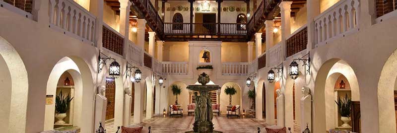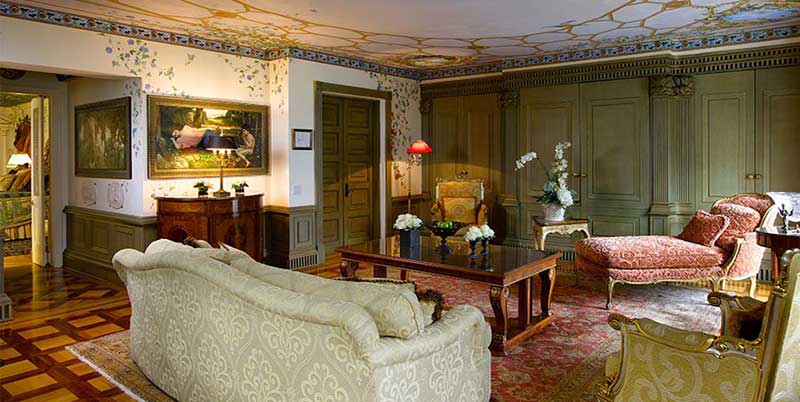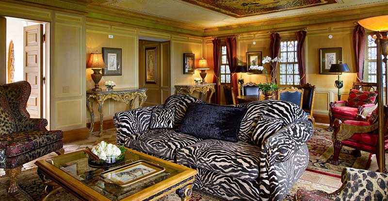 Πληθωρικά διακοσμημένοι τοίχοι και πλούσια υφάσματα -που φέρουν την υπογραφή του διάσημου Ιταλού μόδιστρου- ντύνουν τους χώρους του ξενοδοχείου και το αποτέλεσμα είναι μεγαλοπρεπές.