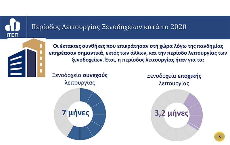 • Η μέση περίοδος λειτουργίας των εποχιακών ξενοδοχείων το 2020 συρρικνώθηκε στους  3,2 μήνες και των συνεχούς λειτουργίας στους 7 μήνες λόγω των έκτακτων συνθηκών που δημιουργήθηκαν.